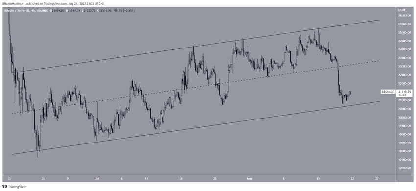 El gráfico de seis horas muestra que BTC ha estado operando dentro de un canal paralelo ascendente desde su punto más bajo el 18 de junio. Dichos canales suelen contener estructuras correctivas, por lo que una eventual ruptura del mismo sería el escenario más probable.
