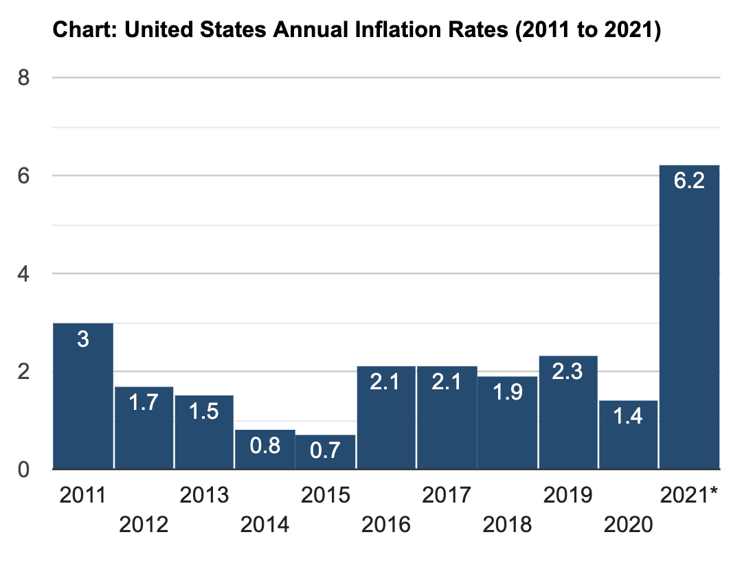 Los últimos datos de inflación comienzan a provocar estragos en la psicología del mercado financiero elevando la inflación a un 6,2% en Estados Unidos, la mayor inflación registrada en 30 años. Un gráfico ilustrativo muestra la grave realidad al comparar los ratios anuales de inflación del último decenio, claramente 2021 es el año con mayor inflación sin haber culminado.