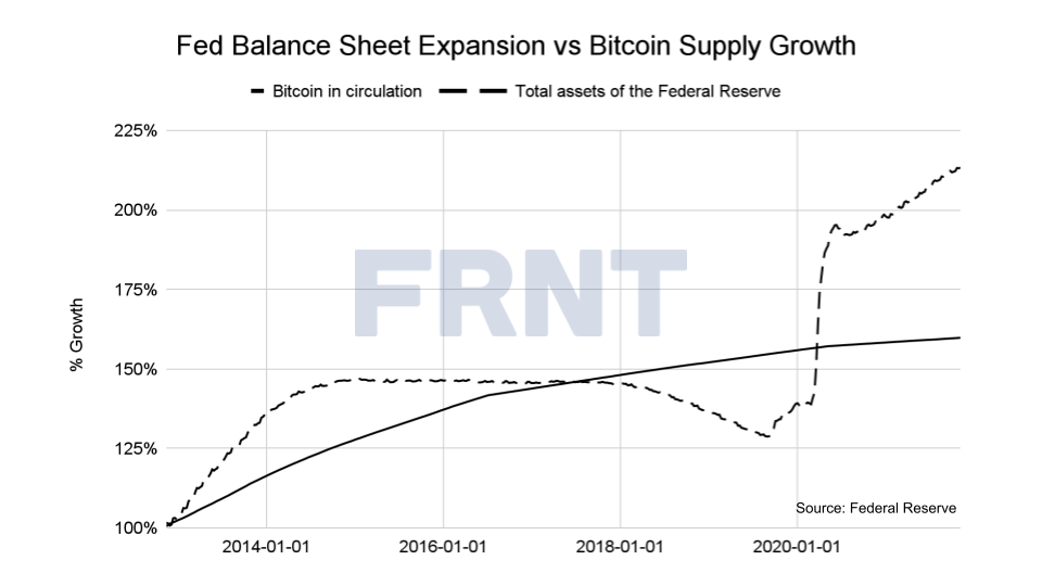 Strahinja Savic, jefe de datos y análisis del proveedor de criptoderivados FRNT Financial Inc., muestra otra forma de ilustrar la protección contra la inflación que ofrece Bitcoin frente a las monedas fiduciarias al trazar la expansión del balance de la Fed frente a la oferta de la criptomoneda, concluyendo: