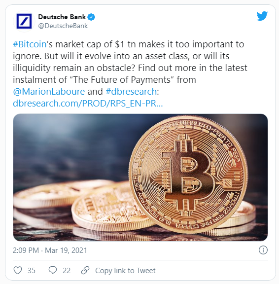 Deutsche Bank publicó su última investigación sobre “El futuro de los pagos”. El banco dijo que Bitcoin era demasiado importante para ignorarlo. Sin embargo, en un tweet del 19 de marzo, el banco también plantea la cuestión de si la escasez de liquidez que acompañó al auge actual lo está perjudicando.