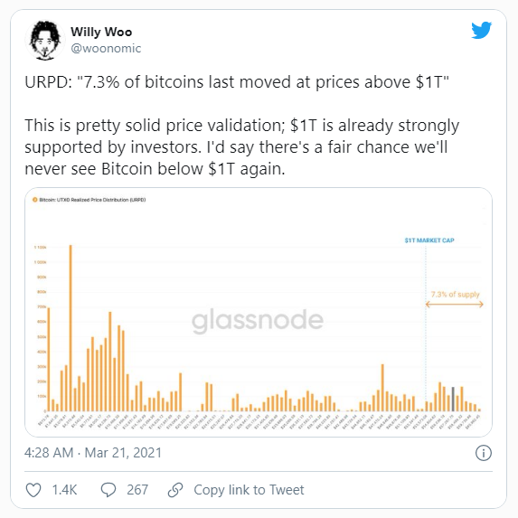 El analista de Bitcoin en cadena, Willie Woo, tuiteó el 21 de marzo sobre los movimientos de Bitcoin desde que BTC alcanzó 1 billón de dólares en capitalización de mercado. Desde que la moneda alcanzó el marcador en febrero, el 7.3% de BTC fueron movidos.