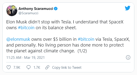 El fundador de SkyBridge, Anthony Scaramucci, tuiteó el 19 de marzo que la empresa SpaceX de Elon Musk posee Bitcoin en su balance. Afirma que Musk tiene más de 5 mil millones de dólares en BTC entre SpaceX, Tesla y todas sus propiedades.