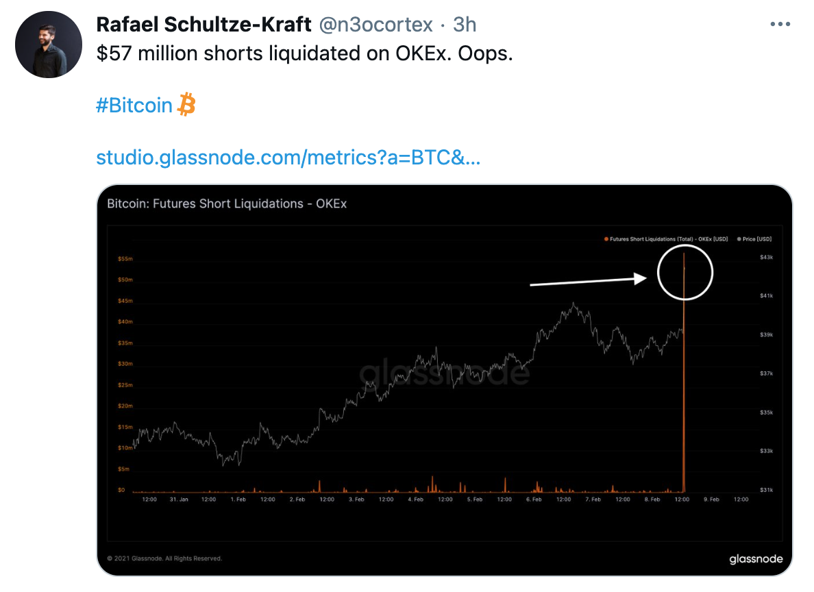 El precio de Bitcoin se disparó el lunes por la mañana 8 de febrero y se llevó consigo millones de dólares de los traders que tenían posiciones en corto con BTC.