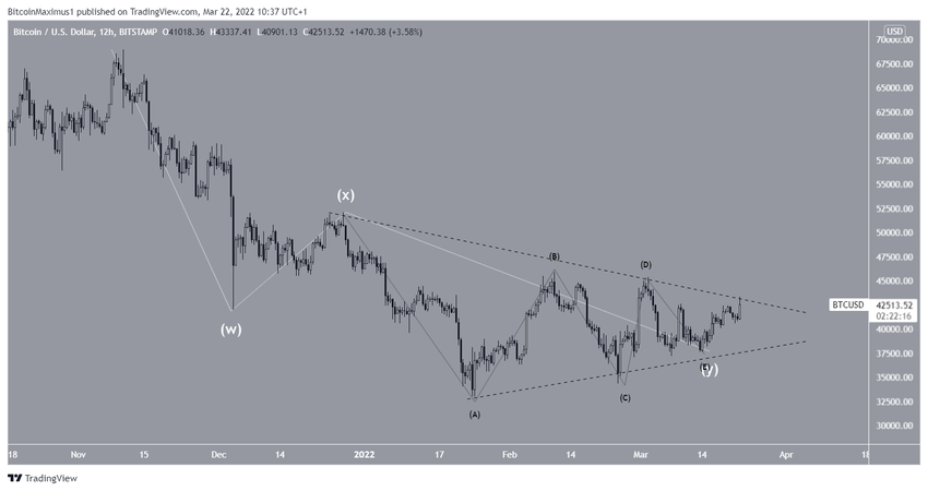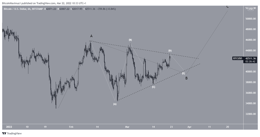 El recuento más probable sugiere que BTC está en un triángulo de onda B. Una vez que se complete el triángulo, se esperaría una ruptura y un movimiento hacia los 50,000 dólares.