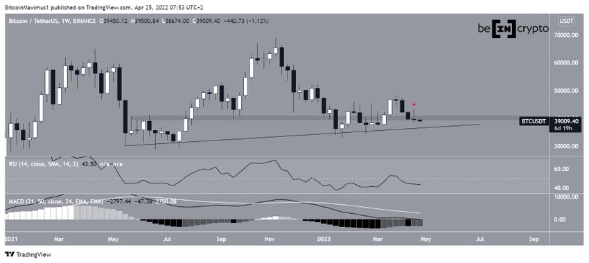 A pesar de esto, BTC todavía cotiza por encima de una línea de soporte ascendente que ha estado vigente desde mayo de 2021. Actualmente, la línea está cerca de 38,000 dólares.