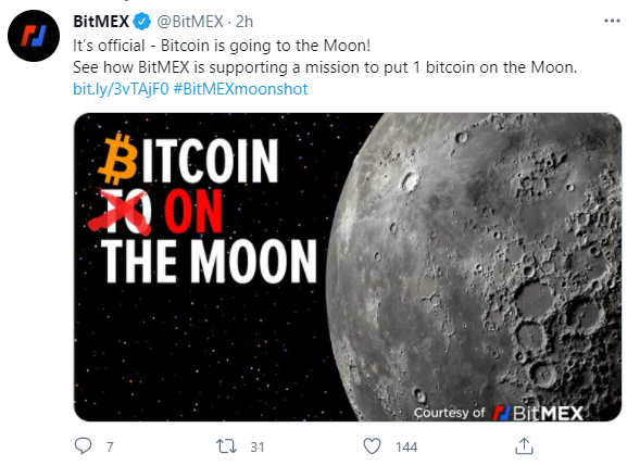 El exchange BitMex ha anunciado su asociación con la empresa de robótica espacial Astrobotic para enviar 1 BTC a la superficie lunar a través de una próxima misión espacial que podría realizarse a finales de este año.