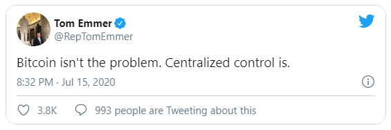 El miembro de la Cámara de Representantes de Estados Unidos, Tom Emmer, cree que Bitcoin llegó para quedarse e incluso ve un lado positivo para la criptomoneda a raíz de la pandemia.