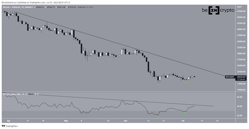 BTC ha estado cayendo por debajo de una línea de resistencia descendente desde el 5 de abril. Después de ser rechazado el 7 de junio, el precio continuó bajando hasta el 18 de junio a un mínimo de 17,622 dólares.