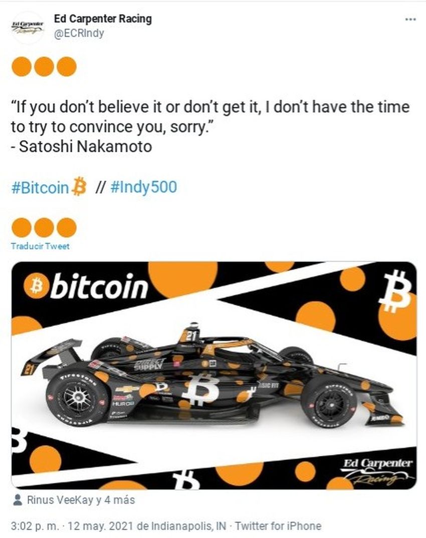 La 105ª edición de las 500 Millas de Indianápolis (INDY 500) contará con un automóvil patrocinado por Bitcoin. Ed Carpenter Racing tendrá un Chevrolet BTC completamente diseñado con el número 21.