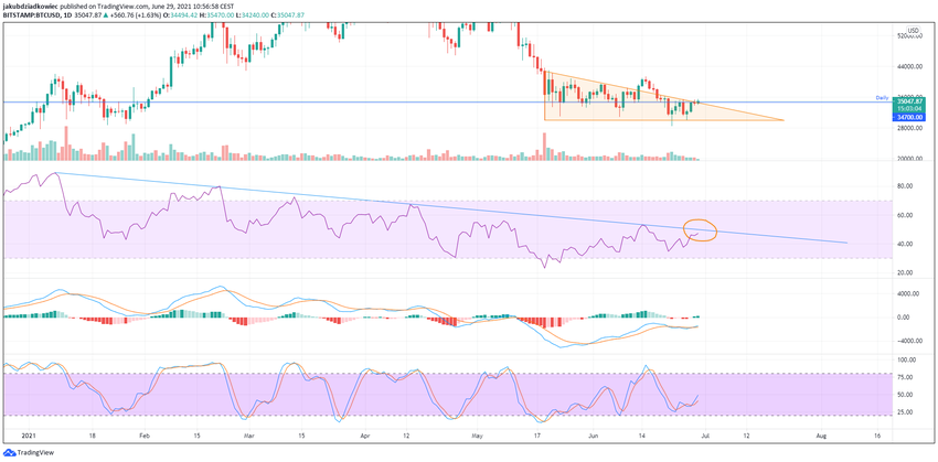El 13 de junio, hubo una falsa ruptura de esta estructura, validando el nivel de 40,500 dólares como resistencia y regresando al fondo del rango. Actualmente, vemos otro intento de salir del triángulo y superar el nivel de resistencia clave en 34,700 dólares (línea azul).
