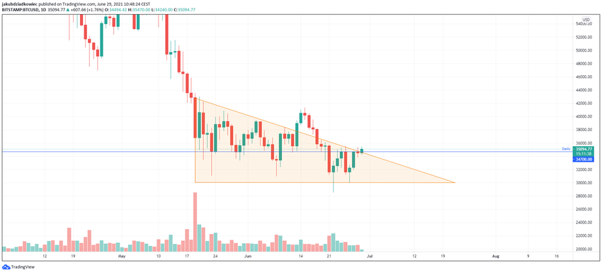El gráfico diario proporciona una perspectiva más alcista. Desde el 19 de mayo, el precio de Bitcoin parece haber formado una estructura de triángulo descendente, cuya base coincide con el área de 30,000 dólares. Esta área ya ha sido probada y validada como soporte varias veces.