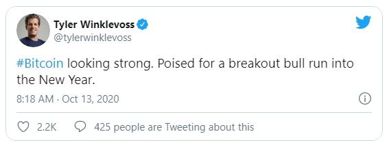 No es difícil adivinar de qué lado está el multimillonario de Bitcoin, Tyler Winklevoss. Está pronosticando que el precio está “listo para un rally alcista hasta Año Nuevo”. La predicción del cofundador de Gemini podría tener algo que ver con el último plan de estímulo de la Reserva Federal, que implica otros 1,8 billones de dólares para el alivio del coronavirus. Winklevoss en un tweet lo llamó una “campaña publicitaria de Bitcoin”, y lo remató con “hasta la luna”.