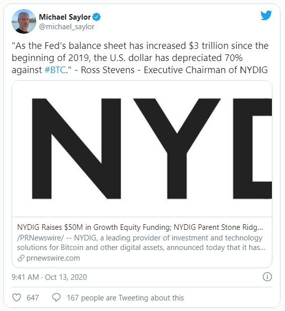 El sentimiento positivo en el mercado Bitcoin últimamente se ha visto impulsado en gran parte por la participación de las empresas estadounidenses en el espacio cripto, incluida MicroStrategy, que puso en marcha su inversión de 425 millones de dólares en BTC para su tesorería. El 13 de octubre, Stone Ridge, una empresa de gestión de activos de 10 mil millones de dólares, reveló que compró 10,000 BTC (con un valor aproximado de más de 100 millones de dólares) y que está bajo la custodia de su subsidiaria, NYDIG.