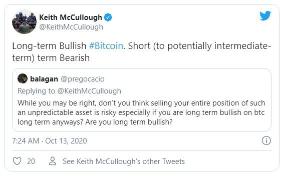 Más recientemente, esa estrategia lo ha dejado al margen, ya que el precio de BTC ha ido acumulando ganancias, lo que ha colocado un objetivo en su espalda por parte de la comunidad cripto. McCullough ha estado defendiendo su decisión, diciendo que vendió lo último de su posición en 10,600 dólares. Más recientemente, en respuesta a una pregunta en un hilo de Twitter, explicó que es “alcista a largo plazo” y “bajista a corto (o potencialmente intermedio)” en el precio de BTC.