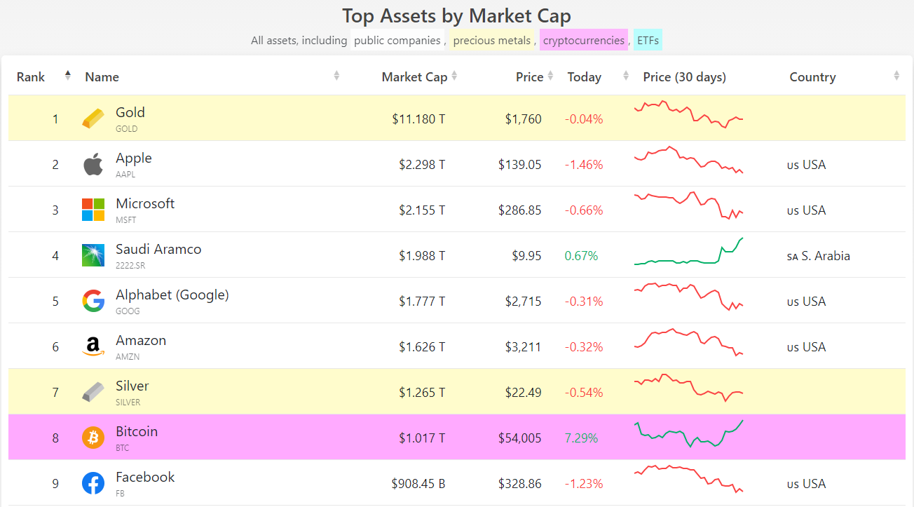 Gracias a las cifras registradas por Bitcoin el día de hoy, la criptomoneda alfa se ha consolidado como el octavo activo más valioso a escala global, según los datos de CompaniesMarketCap.