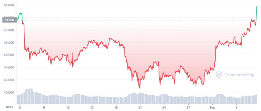 SponsoredAl momento de la publicación, Bitcoin (BTC) cotiza en 54,297 dólares, un crecimiento vertiginoso del 8% en las últimas 24 horas, según los datos de CoinMarketCap. Por si fuera poco, la cifra representa un aumento del 31% en los últimos 7 días.