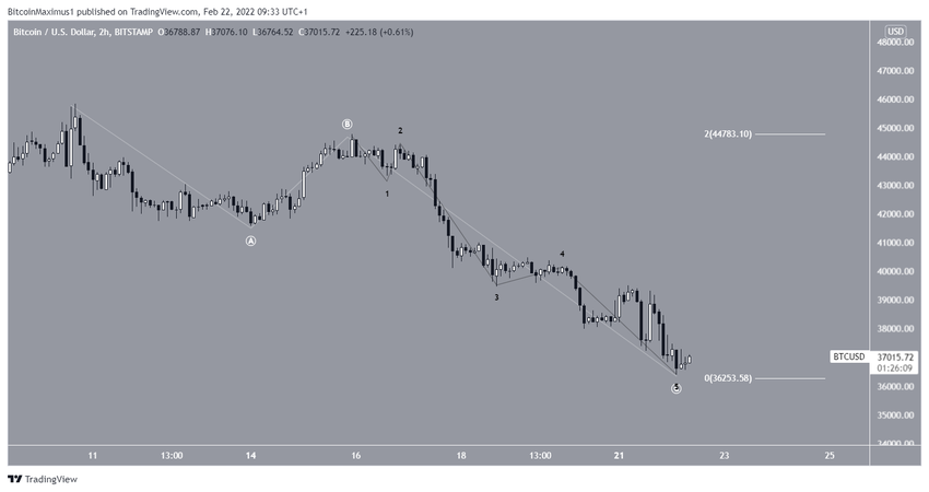 Bitcoin ha estado cayendo desde el 15 de febrero, cuando fue rechazado cerca del área de resistencia de 44,200 dólares por segunda vez (icono rojo). Hasta ahora, alcanzó un mínimo de 36,350 dólares el 22 de febrero.