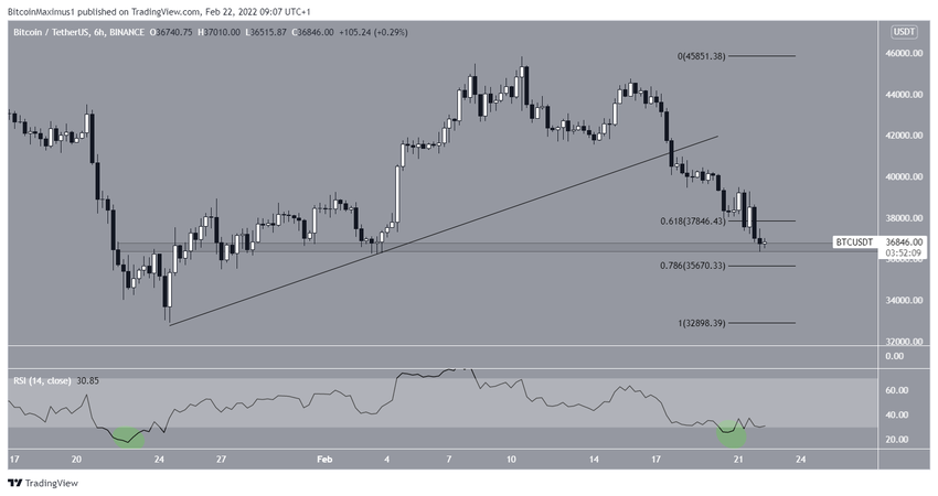 El gráfico de seis horas muestra que BTC ha tenido una ruuptura desde una línea de soporte ascendente. Actualmente, se cotiza entre los niveles de soporte de retroceso de Fibonacci de 0.618 y 0.786 a 35,700 dólares y 37,700 dólares. Esta área es también un nivel de soporte horizontal.