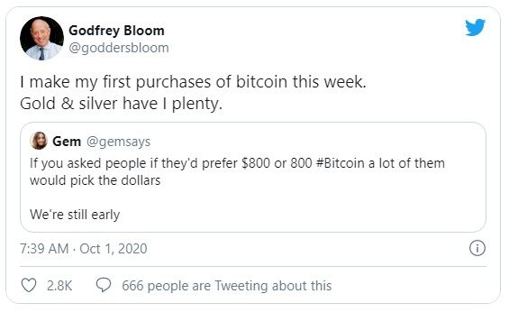 Bitcoin también atrajo a otro nuevo inversor en los últimos días. El ex-eurodiputado del UKIP Godfrey Bloom anunció en Twitter que compró BTC por primera vez y dijo que ya tenía muchos activos de oro y plata en su cartera. Bloom tiene 70 años y busca aprender más sobre las criptomonedas.