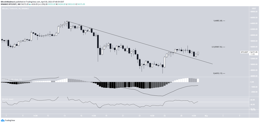 El 28 de abril, BTC alcanzó el nivel de retroceso de 0,5 Fib al medir desde el precio máximo de todos los tiempos, encontrado en 55.900 dólares.