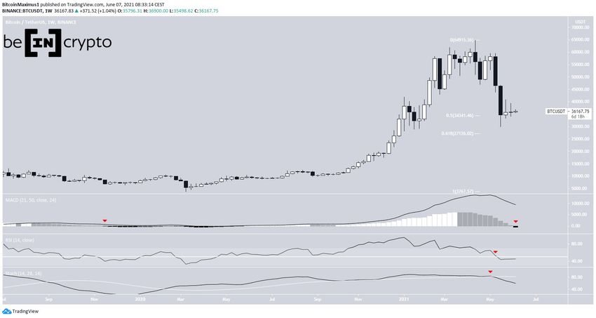 Actualmente, BTC está cotizando en el nivel de soporte de retroceso de 0,5 Fib en $34,340. El siguiente soporte está en 27.125$, que es el nivel de soporte de 0,618 Fib.