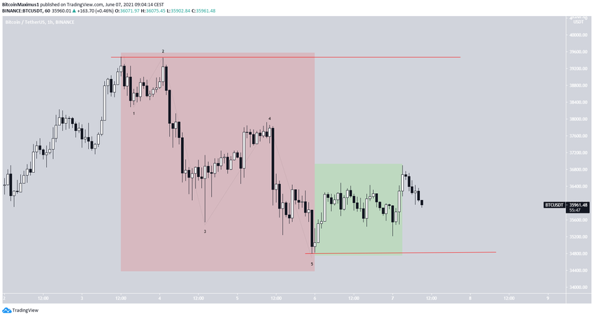 El gráfico de seis horas vuelve a ser bajista. El 4 de junio, la línea de soporte de un canal descendente paralelo actuó como resistencia. Rechazó a BTC, creando la vela envolvente bajista anteriormente descrita.