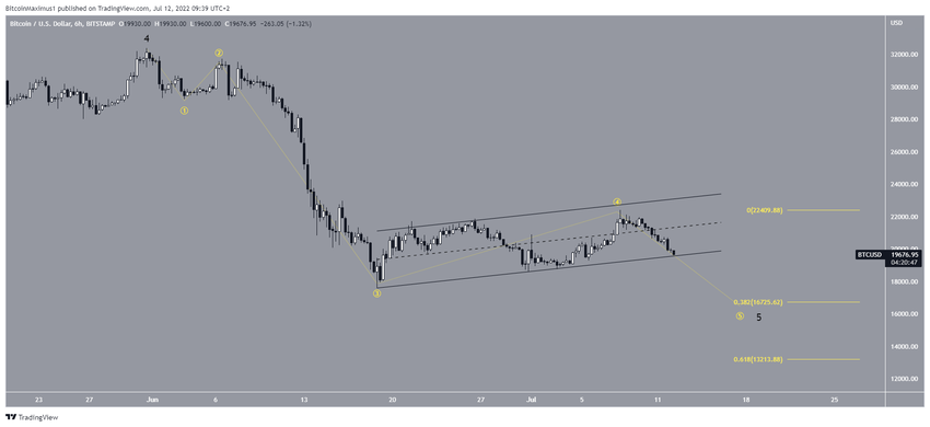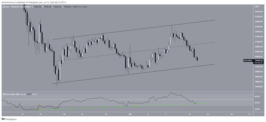 El gráfico de seis horas muestra que BTC ha estado operando dentro de un canal paralelo ascendente desde el 19 de junio. Dichos canales generalmente contienen movimientos correctivos y probablemente significan que la tendencia subyacente es bajista.