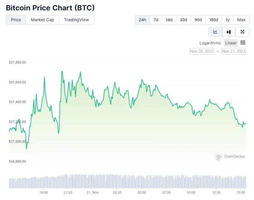 SponsoredSegún CoinGecko, la principal criptomoneda se cotiza actualmente a 37,190 dólares. En las últimas 24 horas, el valor de BTC aumentó ligeramente: 0,2%.