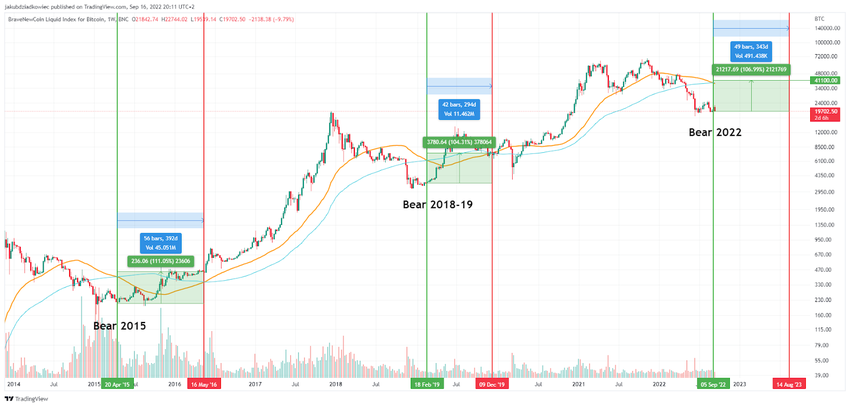 Ahora, si quisiéramos extrapolar estos escasos datos al gráfico actual, podemos intentar calcular el precio de BTC y el tiempo en que alcanzará el próximo cruce alcista. Promediando los datos históricos al alza, obtenemos un 107,5%, y puntualmente, 49 semanas.