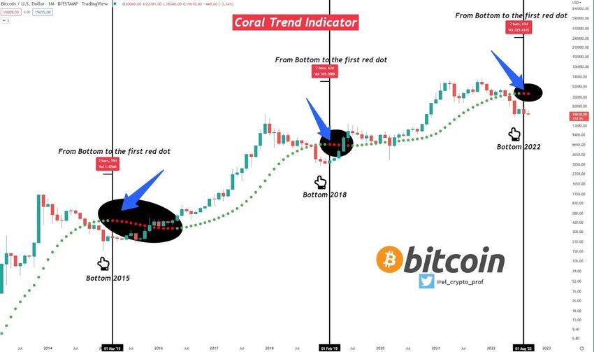 El analista señala que el primer punto rojo en el gráfico del Coral Trend Indicator apareció aproximadamente 60 días después de alcanzar el fondo absoluto del mercado bajista (flechas azules). Esto sucedió tanto en 2015 como a finales de 2018-2019.