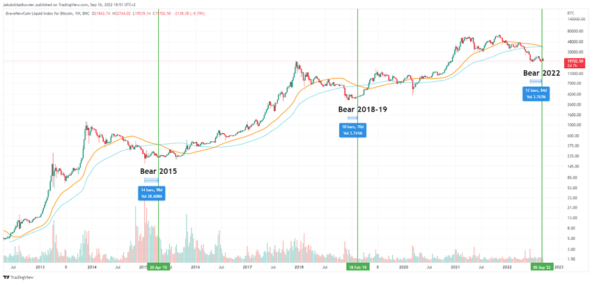 - 2022: 12 semanas / 84 días desde el fondo a 17,607 dólares.