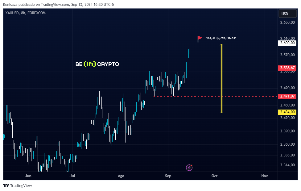 El metal precioso ha sido uno de los mejores exponentes del mercado desde 2022, todo parece indicar que su siguiente objetivo será el área de los 2,600 dólares por onza.