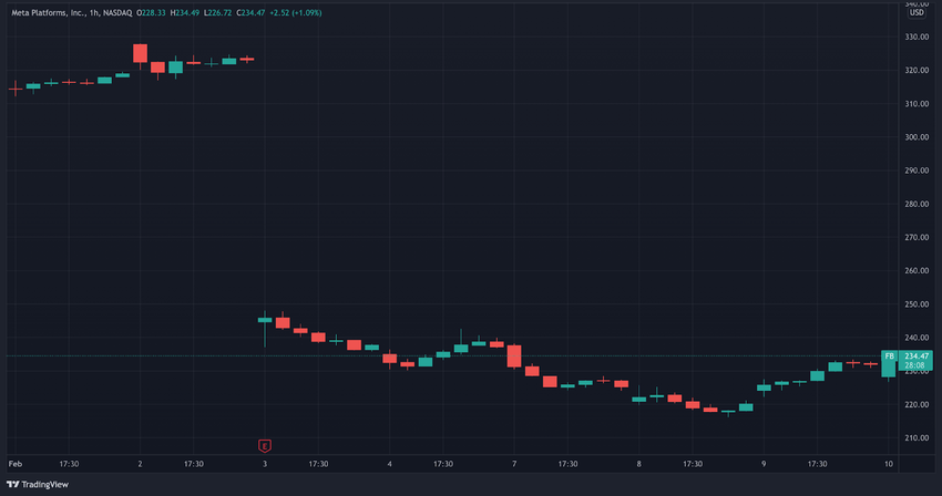 Desde entonces, FB ha seguido bajando, llegando a 230 dólares el 4 de febrero, luego a casi 215 dólares el 9 de febrero. Se recuperó un poco desde entonces y actualmente cotiza alrededor de 230 dólares.