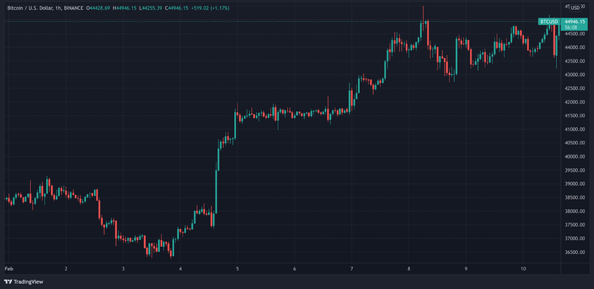 SponsoredSin embargo, comenzó a caer un poco el 2 de febrero, terminando en 36,500 dólares el 3 de febrero. BTC se disparó al día siguiente, alcanzando los 41,000 dólares el 5 de febrero, donde permaneció hasta el 7 de febrero.