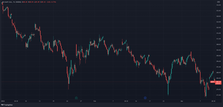 MSFT pareció ganar un impulso alcista en febrero, alcanzando 315 dólares el 2 de febrero, pronto continuó con una tendencia a la baja nuevamente. Para el 23 de febrero había llegado a casi 270 dólares. Se produjo otra breve recuperación en marzo, pero MSFT actualmente está abajo, cotizando alrededor de 280 dólares.