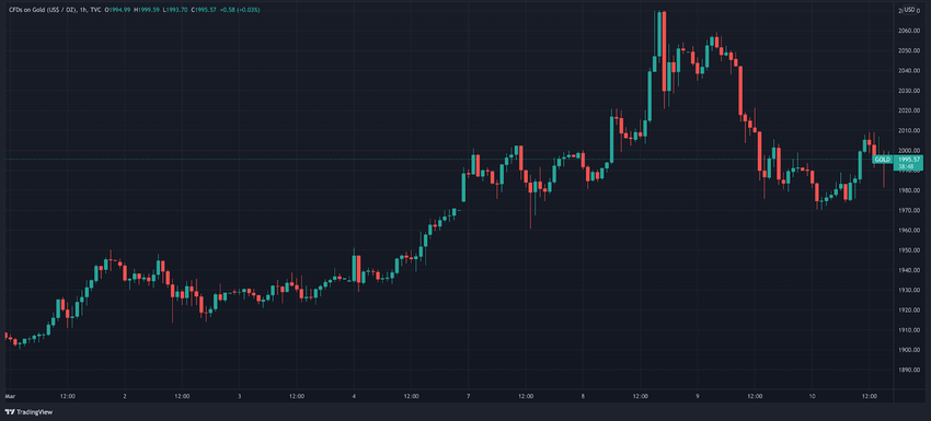 Si bien se retrasó unos días, el 7 de marzo había subido a 2,000 dólares. A pesar de algunas caídas, siguió subiendo, alcanzando los 2,070 dólares el 8 de marzo. Desde entonces, la presión de venta ha vuelto, lo que ha hecho que el oro vuelva a caer justo por debajo de los 2,000 dólares.