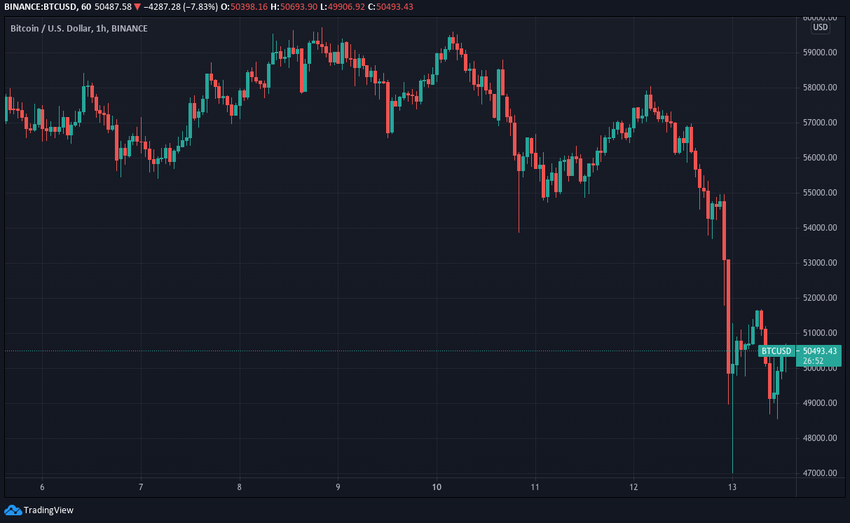Sin embargo, al final del día, el precio bajó significativamente hasta los 47,000 dólares, el 13 de mayo. Bitcoin cotiza actualmente en aproximadamente 50,000 dólares.