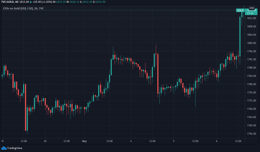 A partir de ahí, estuvo justo por encima de los 1,776 dólares, luego comenzó a subir, lo que continuó el 6 de mayo. Luego, alrededor del mediodía, se disparó más allá de los 1,800 dólares, hasta donde actualmente cotiza en aproximadamente 1,815 dólares.