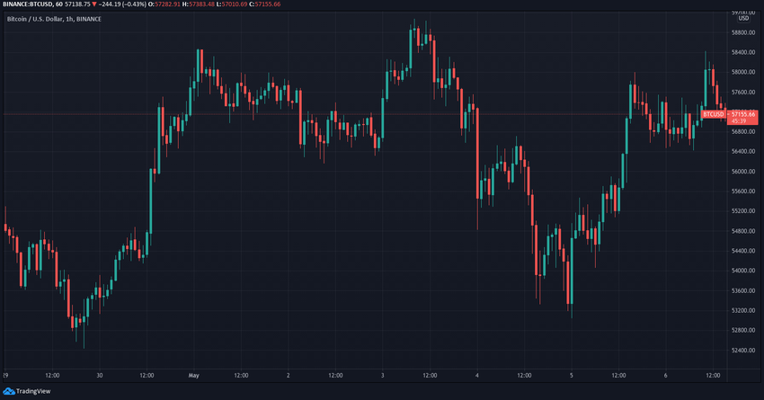 Al abrir el 5 de mayo, BTC cotizaba a 53,300 dólares, pero volvió a subir a casi 58,000 dólares más tarde en el día. El 6 de mayo, BTC alcanzó nuevamente los 58,000 dólares, pero ahora cotiza justo por encima de los 57,000 dólares.