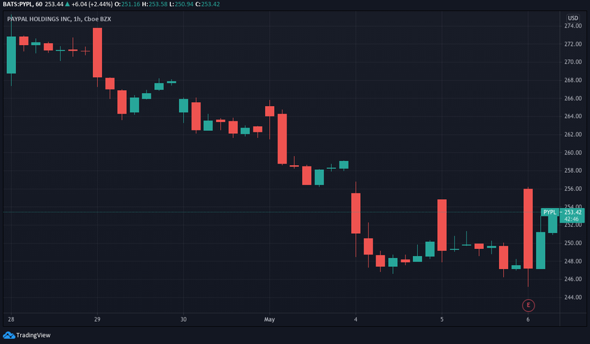 Desde alrededor de 274 dólares registrados la semana pasada, PYPL ha estado bajando día a día, antes de alcanzar el soporte en aproximadamente los 246 dólares el 4 de mayo. Aunque después de cerrar el 5 de mayo, las acciones subieron más del 5% a la luz de un exitoso informe de ganancias.