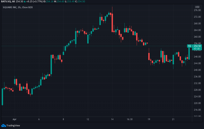 En una trayectoria ascendente desde principios de abril, SQ alcanzó un máximo reciente de 278 dólares, el 14 de abril, el mismo día en que BTC alcanzó su último máximo histórico. Desde entonces, también se ha corregido un poco y ahora cotiza alrededor de 255 dólares.