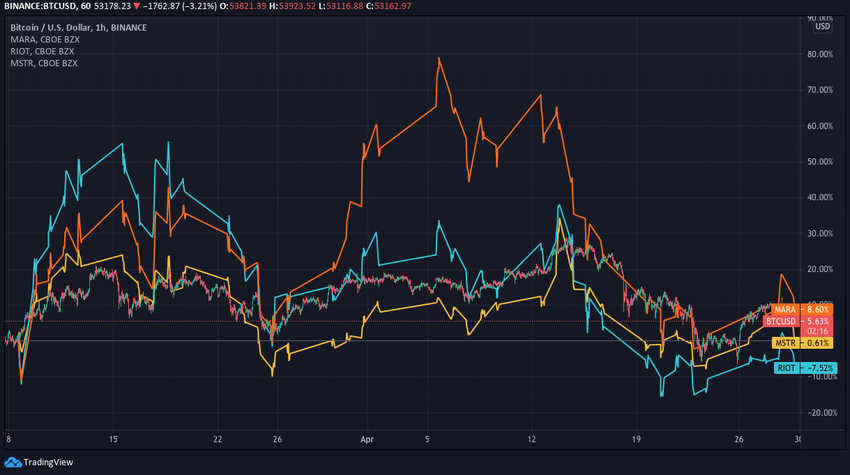 Sin embargo, a partir de aquí, los tres cayeron cuando BTC experimentó una corrección después de la lista de Coinbase. Aunque las ganancias de MARA y MSTR son ligeramente mejores que a principios de marzo, como BTC, RIOT ha bajado un 7,5%.