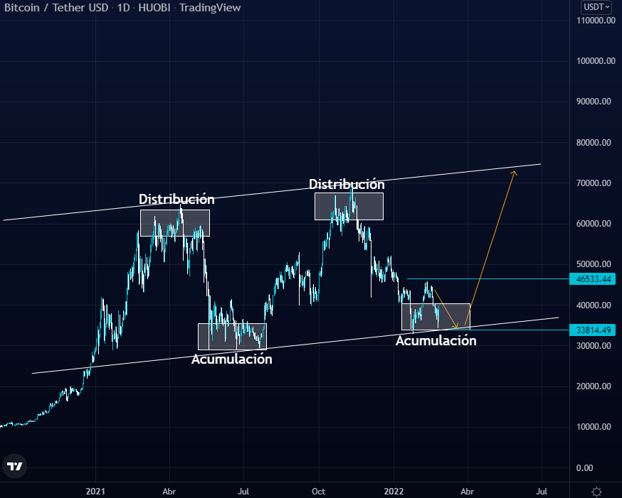 Con el movimiento de la presente semana se puede concluir que Bitcoin ha entrado en una posible fase de acumulación, ahora lo que se espera para las próximas semanas es que la cotización en el precio de Bitcoin se comprima entre los 40,000 dólares y los 34,000 dólares, para asi dar inicio al ciclo alcista con proyección a los 73,300 dólares.