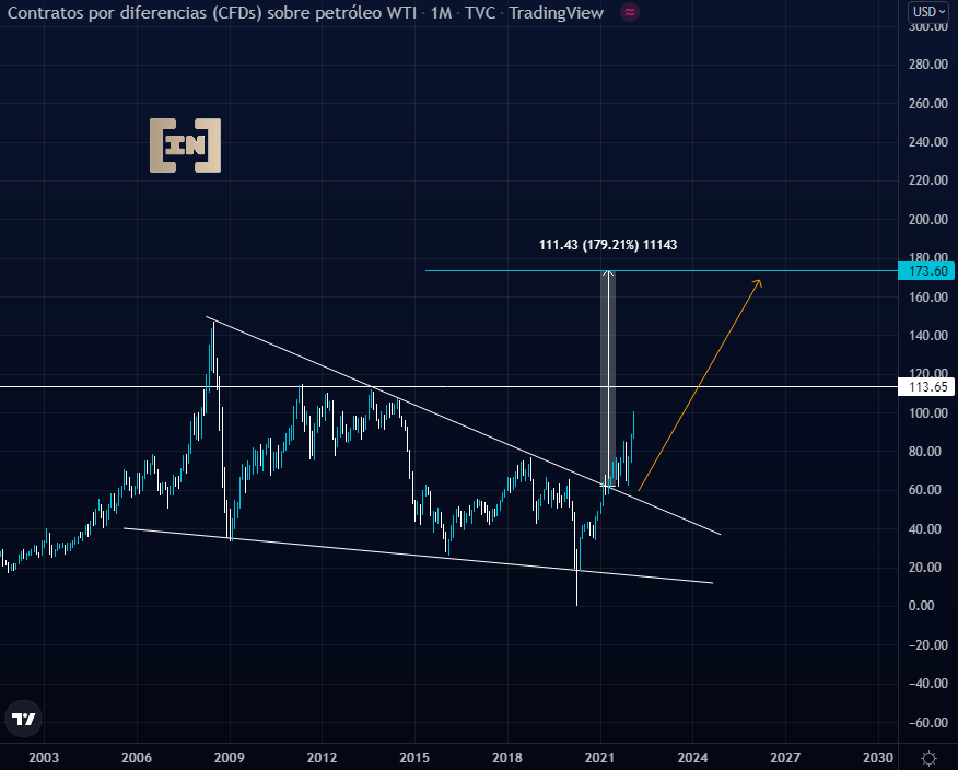 Como se puede apreciar, el precio del petróleo ha perforado al alza el triángulo simétrico en tiempos mensuales, por lo que se prevé una continúan alcista para el 2027-2030 una subida a los 173 dólares por barril.