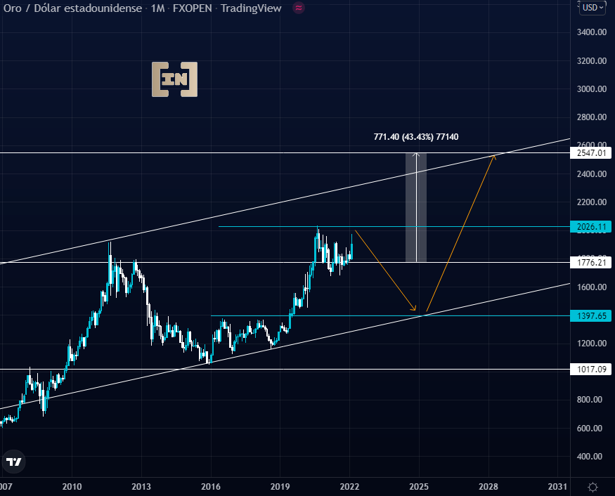 En las lecturas semanales se ha sugerido que el oro se encuentra en una fase de distribución puede presentar un impulso alcista más que lo lleve a ubicarse en los 2,200 dólares, pero si no logra mantenerse por encima de los 1,776 dólares, el escenario descendente propuesto hasta principios del 2023 con proyección a los 1.400 dólares no debe descartarse.