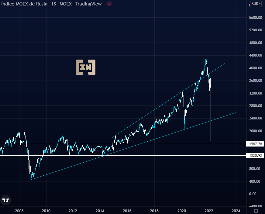 Iniciamos con la bolsa de Moscú al presentar el mayor impacto bajista esta semana, tras la respuesta bélica por parte del Kremlin la cotización del índice MOEX cae cerca de los 1600 puntos, un área que desde el 2010 y 2016 no se veía.