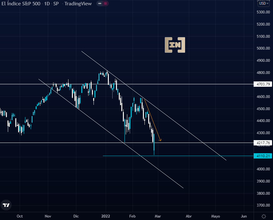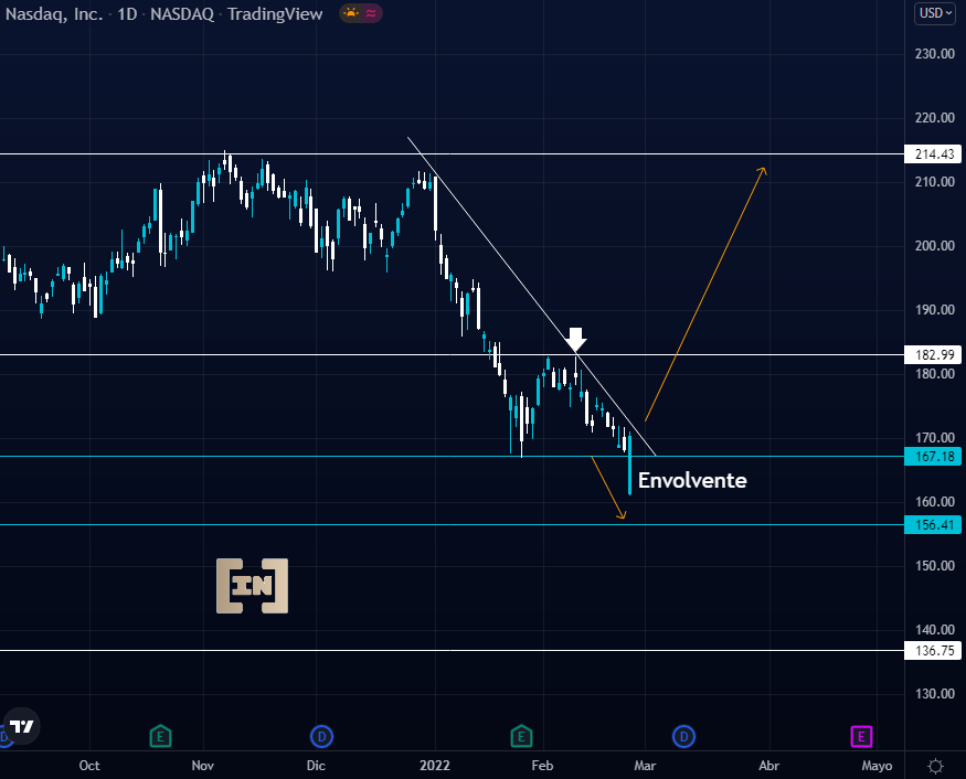En el índice del NASDAQ se puede apreciar mejor la vela envolvente creada el 24 de febrero, un gran retroceso y con vela completa, dando a concluir la buena manipulación en Wall Street por socavar la caída generada por las acciones del Kremlin.