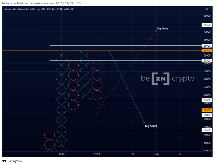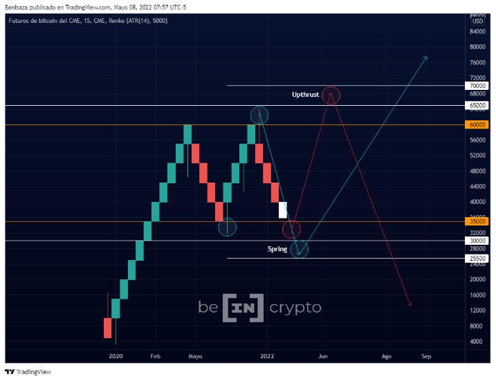 Haciendo uso de las velas Renko se puede apreciar al detalle como el obstáculo inmediato es la barrera psicológica comprendida entre los 35,000 dólares y 30,000 dólares. Se podría considerar como área de recompra por los inversores institucionales.