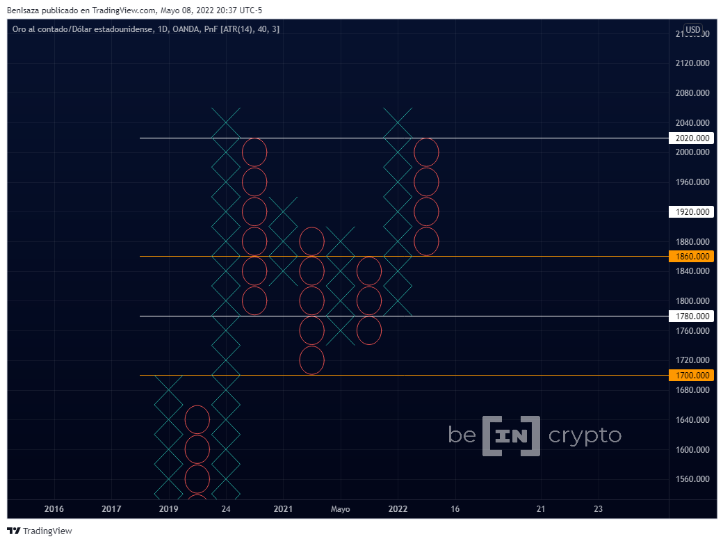 Haciendo uso del gráfico punto y figura se puede apreciar al detalle cada una de las próximas barreras que tiene el oro para una continuidad bajista. El precio de los 1,700 dólares por onza se considera el último soporte solido en tiempo diario, por el cual confirmaría una continuidad bajista con objetivo alcanzar los 1,400 dólares.