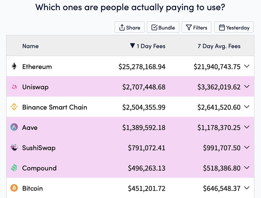 Incluso el protocolo de préstamos DeFi, Compound, superó a Bitcoin en términos de tarifas diarias generadas.